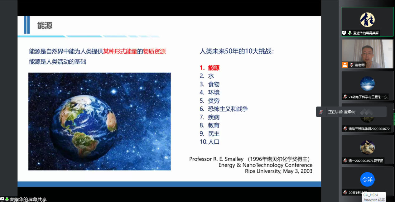 2022年7月8日上午8:30-12:30,暨南大学麦耀华教授在腾讯会议上做了题为《高效率钙钛矿太阳电池与组件》的学术报告,米兰milan官方网站的部分本科生、研究生以及教师参加了本次活动。麦耀华教授从能源角度入手,阐述了全球能源形势,碳达峰和碳中和等当前热点话题,引出太阳能的优势、发展历史及研究现状,最后介绍了钙钛矿太阳电池的相关技术及应用前景。麦教授的讲座图文并茂,深入浅出,将深奥的太阳能技术讲的浅显易懂,参会师生纷纷表示讲座精彩生动,受益匪浅,对中国光伏产业发展的未来有了更多的了解和期待。