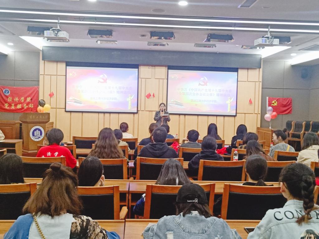 11月4日晚19:40,beat365官方网站党员服务站在新图书馆第一会议室组织开展党员学习活动,传达学习党的十九届四中全会精神,本次活动由学院副书记于频主持,近百名学生党员参加了学习。