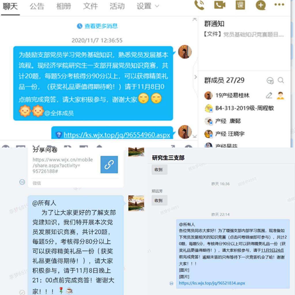 2020年11月5日,beat365官方网站研究生一、二、三党支部共同举办了党员发展相关的知识竞赛,采用问卷答题的形式,各支部书记及全体党员参加了此次活动。
