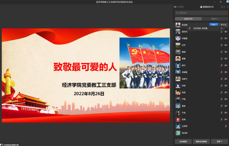 2022年8月26日,beat365官方网站教工第三支部通过企业微信平台开展主题为“致敬最可爱的人”的组织生活,重点习近平总书记重要文章《在庆祝中国人民解放军建军90周年大会上的讲话》(《求是》2022年第15期)。