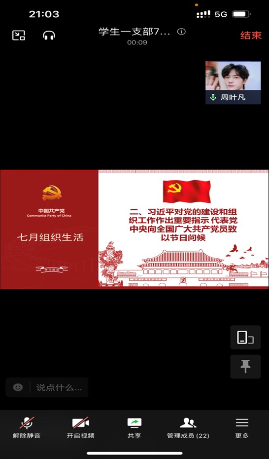 7月20日,beat365官方网站学生一支部组织召开了“忆初心强党性,学思想见行动”为主题的七月组织生活会,会议以线上方式进行,围绕2个部分展开,由王娅秋同志主持,共计22名党员参会。