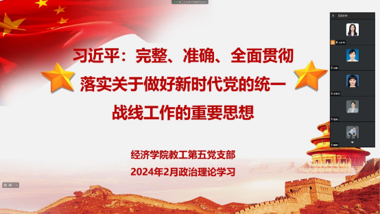 2024年2月22日,beat365官方网站教工第五支部通过企业微信开展二月组织生活,集体学习习近平总书记在中央统战工作会议上讲话精神,即完整、准确、全面贯彻落实关于做好新时代党的统一战线工作的重要思想。