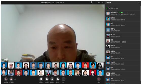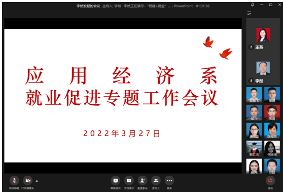 2022年3月27日,应用经济系组织全系教师线上召开2018级经济学专业就业推进专题工作会议,会议由系主任李然主持,学院副书记、副院长王燕教授及张涛、张国培两位辅导员老师参加了此次会议。会议分为三个议程:首先,两位辅导员老师介绍2018级经济学专业目前就业情况,然后,各位老师介绍自己所指导的学生就业情况,最后,王燕副书记做了总结讲话。