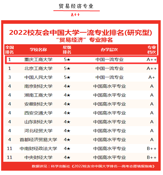 近日,第三方大学评价机构艾瑞深校友会网出版了《2022校友会中国大学排名:高考志愿填报指南》,最新发布校友会2022中国大学一流专业排名、2022中国大学各专业类一流专业排名,beat365贸易经济专业在2022中国大学一流专业“贸易经济”专业排名中处于A++档,位列全国第一。校友会中国大学一流专业排名是目前中国参评高校数量最多和参评专业规模最大的中国大学本科专业排名,至今已经连续8年发布。