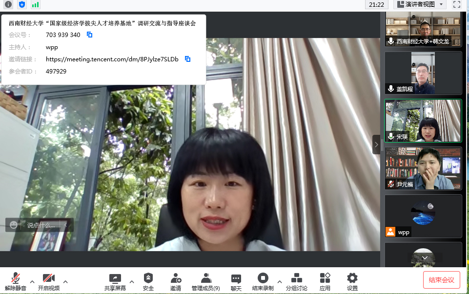 第二阶段,参会人员对基地建设进行深入研讨。宋瑛副院长从指导思想、建设目标、工作进展、建设与改革思路、重点任务、具体任务和项目分解以及存在的问题和困难介绍了经济学拔尖人才培养示范基地建设推进情况。尹元福副院长谈到了经济学拔尖人才培养示范基地的方案如何切实落地,实现学生和老师的双向激励制度,加强平台建设和课程建设,着力打造“书院制”等方面。黄潇副院长就基地的人才培养合作、学术活动开展、科研导师聘请等方面与参会人员进行探讨和交流。应用经济系系主任李然从基地的培养方案制定、考研率的提升、人才培养机制的建立、选拔与退出机制的建设等方面提出了自己的思考和困惑。国际经济与贸易系系主任蒋兴红则表示期待与西南财经大学beat365官方网站有更多深入学习交流的机会,进一步提高专业建设能力和水平。