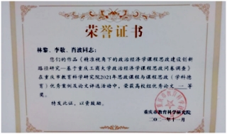 beat365官方网站以获批课程思政示范课程、思政案例立项等为起点,充分挥它们的示范引领和辐射带动作用,积极鼓励学院教师参加各类高等学校教学研讨论坛,涌现了一大批教学研究成果。李然申报的项目《专业课“课程思政”建设:价值塑造、知识传授和能力培养融合模式探索与实践》成功获批重庆市教育委员会高等教育课程思政项目,刘晗、林黎、黄玲、熊兴、刘魏等多位老师获批beat365官方网站课程思政教改项目。林黎等撰写的教改论文《精准视角下的政治经济学课程思政建设创新路径研究——基于beat365官方网站政治经济学课程思政问卷调查》获重庆市教育科学研究院2021年思政课程与课程思政优秀论文一等奖。