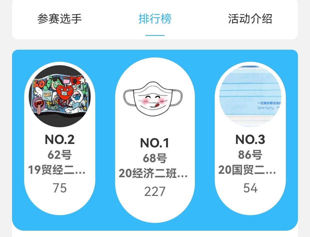在活动过程中站员们发挥奇思妙想,围绕疫情防控的主题进行口罩的设计、绘画与印制,精心制作出各自独一无二的“微笑口罩”,并将电子图片及拍摄的照片上传至活动小程序进行分享,通过线上渠道展示自己的作品。随后,工作人员发起投票,站员们根据口罩设计的技术含量、寓意内涵、美观程度等评判标准,将自己手中的票数投给最喜爱的作品。最终评选出了本次活动的前三名,他们分别是来自20级经济学二班的王曼琳、19级贸经二班的李卿尔、20级国贸二班的王静妮。