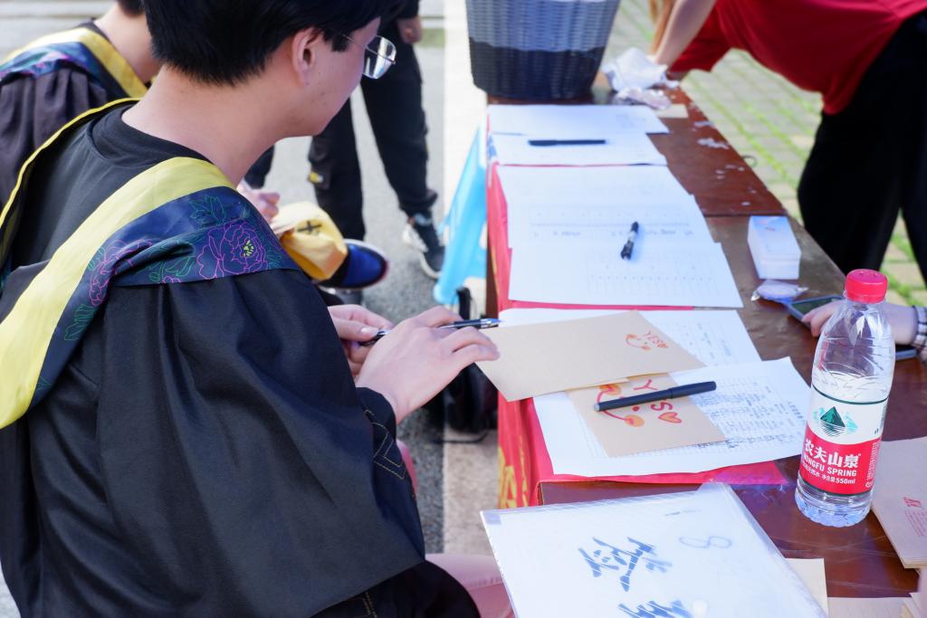 文字不仅仅是记录信息的媒介,更是承载情感与故事的最佳方式。通过信件的形式,站员们用朴实无华的文字记录下了大学生活的点点滴滴,回忆了求学路上的绚烂风景,同时传达了自己对美好未来的憧憬。活动开始前,工作人员在博智楼前的空地布置好帐篷,并为参加活动的同学准备了党服特制的精美礼品。下午两点左右,站员们陆续前往指定地点,并将亲手书写的信件投入到信箱之中。本次活动涵盖面积广,影响范围大,除了报名本次活动的站员,其他学院的学生也积极参与其中。在活动过程中,一些身着学士服的毕业生也将未来的憧憬和对学弟学妹们的寄语留在了活动提供的信纸上,将那一份温暖与希望投递到了现场的信箱当中。随着活动的进行,信箱逐渐填满。尽管站员们的信纸信封不同,字迹字体各异,但每一封信都饱含着站员们同样真挚的情感,每一条寄语都承载着18级毕业生们对未来的无尽期许,传递着人与人之间最真挚的情感。