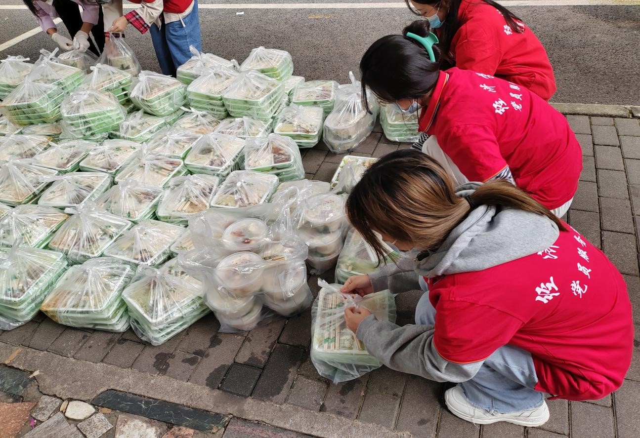 (图为经济党服志愿者在学生公寓北区六栋送餐,在场工作人员摄)