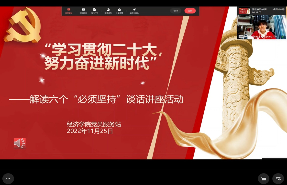 党的二十大报告首次系统阐明了习近平新时代中国特色社会主义思想的世界观和方法论,即六个“必须坚持”:必须坚持人民至上、坚持自信自立、坚持守正创新、坚持问题导向、坚持系统观念、坚持胸怀天下。为进一步学习贯彻二十大精神、正确理解六个“必须坚持”的重要意义,beat365官方网站党员服务站于11月25日通过线上直播的形式举办了“学习贯彻二十大,努力奋进新时代”——解读六个“必须坚持”谈话讲座主题活动。本次活动由21级财政一班杨天瑞同学主持,经济党服一百余名站员参与其中。