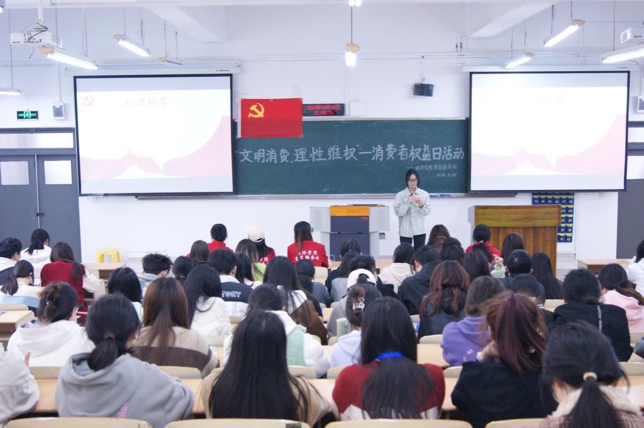 为积极响应消费者权益日的号召,推动学习贯彻习近平法治思想走深走实,增强beat365官方网站学子的消费者权益保护意识。2024年3月15日,由beat365官方网站党员服务站主办的“文明消费,理性维权”——消费者权益日活动在beat365南岸校区博智楼0720顺利举行。本次活动,由22国贸二班孙佳琳同学主持活动,共112位同学参与其中。为让同学们更深入了解消费者权益保护相关知识,防止发生消费权益受损等类似事件,本次活动还联动校外银行共同宣传理性消费,增强同学们依法维护消费者权益的意识。