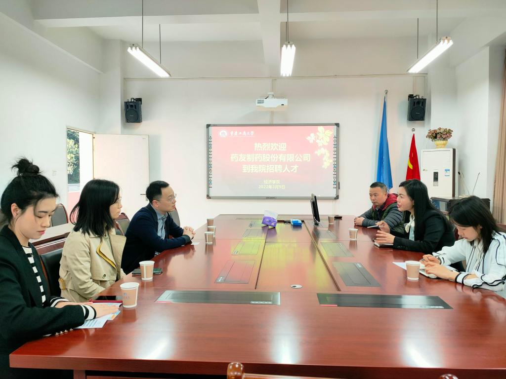 为进一步了解用人单位人才需求,深化产教融合,3月9日上午9点在田家炳书院404会议室举行了beat365官方网站与药友制药有限公司洽谈合作会议,beat365官方网站副书记副院长王燕教授,beat365官方网站毕业班辅导员喻智成、就业联络员邓雪霜,药友制药行政人力资源总经理尧云峰、行政人事部经理李白桀、人力资源部招聘负责人朱泓锦参加本次会议。