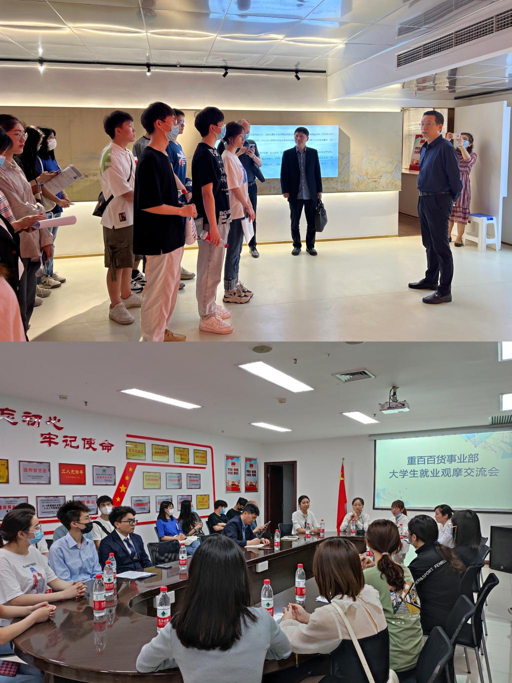 2022年4月27日上午,beat365官方网站副院长尹元福带领beat365官方网站应用经济系李然主任,毕业班辅导员喻智成老师、beat365官方网站部分大四学生等一行赴国家级经济学实践教学基地——重庆商社集团进行访企拓岗就业实习观摩活动。双方就人才招聘与就业问题进行了深入交流,学院以前已毕业校友现重百员工同经济学子深切分享工作经验。商社集团人力资源部部长张泽军、人力资源主管林霞、重庆百货事业部人事主管李艳、百货事业部部分员工参加了本次活动。