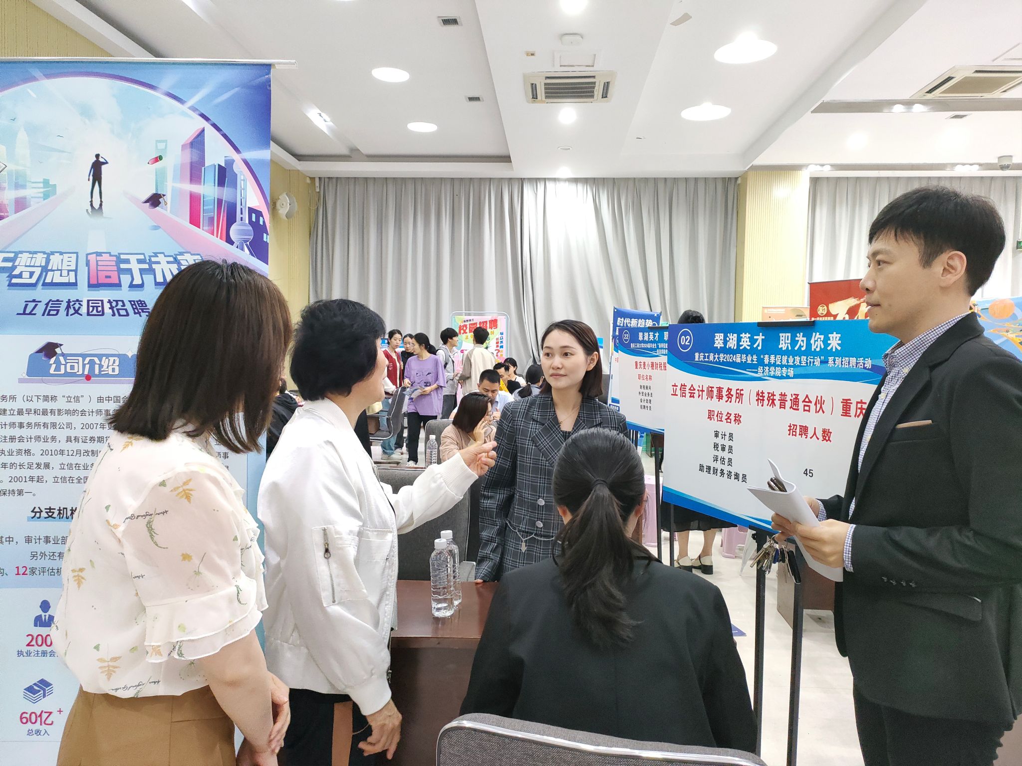在双选会开始之际,学院党委书记李自维、副书记白海龙、财税系主任韩健与重庆市税务师协会白渝副会长、办公室主任彭婧淋就双选会和今后合作进行了充分沟通和交流。在招聘会中,学院领导、系主任汤凤林、蒋兴红、田庆刚、指导老师杨娟、全体辅导员到会与用人单位及学生进行沟通和指导。